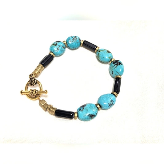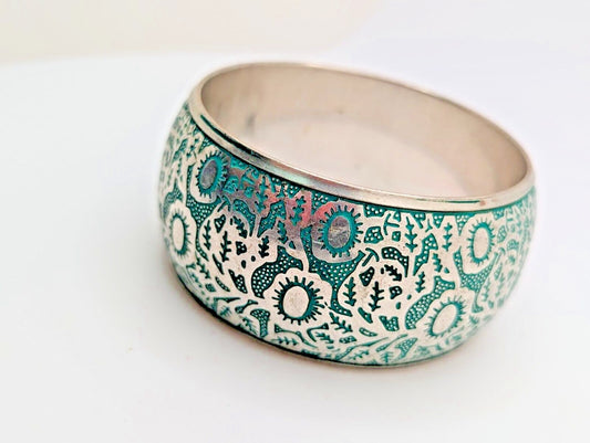 Silver Plated Engraved in Blue Design Bangle Bracelet Aqua Vintage 8"