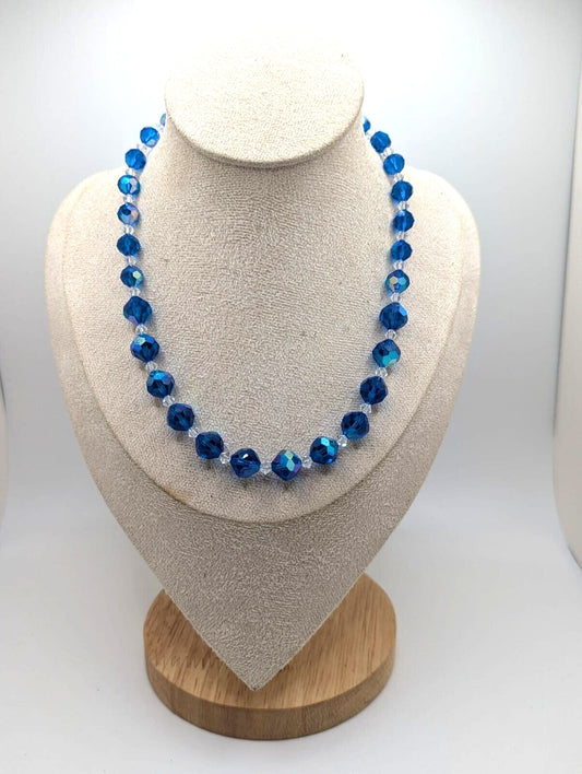 Vintage Blue AB Aurora Borealis Faceted Crystal Beaded Necklace Estate Find