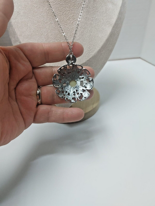 Art Deco Necklace Foux Stone Flower Pendant Tassel Antique Silver 16" long Boho