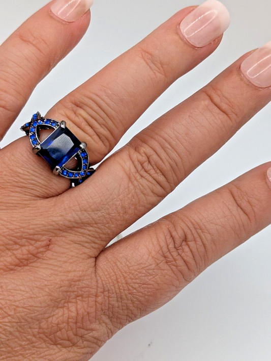 10KT Black Gold Filled Ring Blue Sapphire Simulated Engagement Wedding