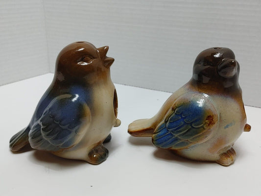 2Pcs Ceramic feeder Bird Figurine Garden Decor Robin Brown Blue Glazed