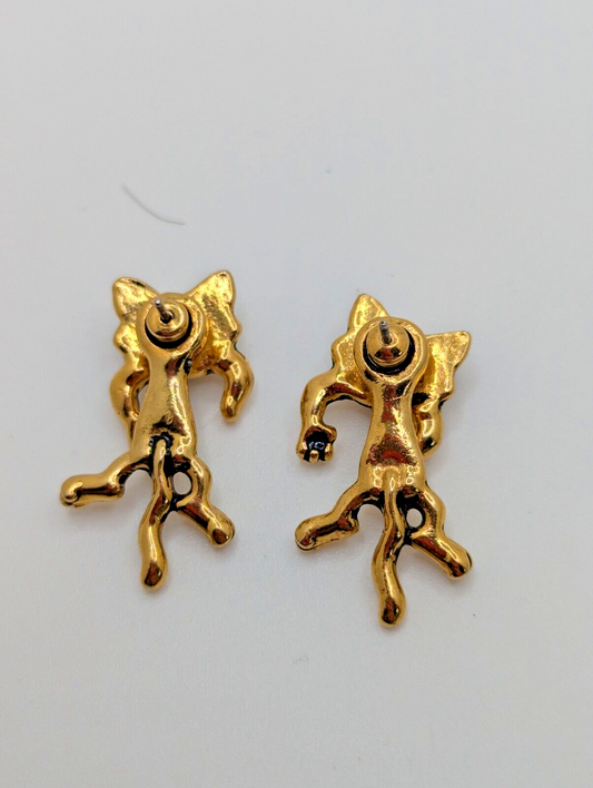 Vintage Stud Pierced Earrings Kitty Cat 2 Part Gold Tone 1-1/8"