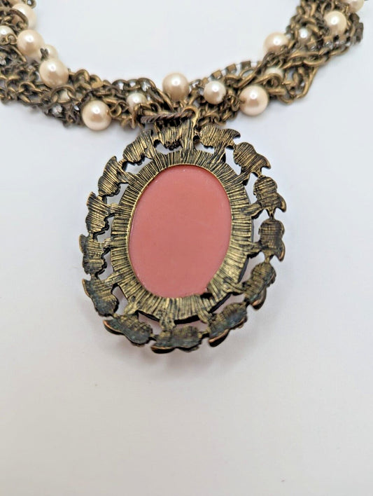 VTG Pink Cameo Pendant Beaded Steampunk Necklace Earrings Rhinestone Faux Pearl