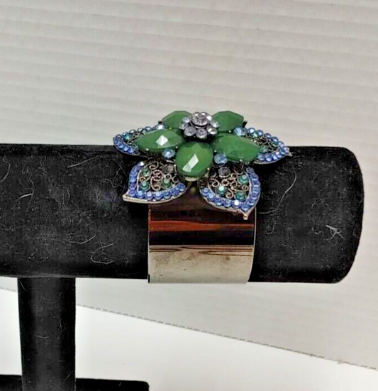 BOHO Gun Metal Green Blue Rhinestone Flower Cuff Bracelet Retro WOMEN Jewelry
