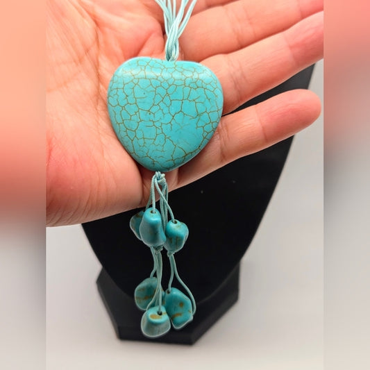 Beautiful Turquoise Chip Bead Howlite Heart Tassel Pendant Necklace 16.5”