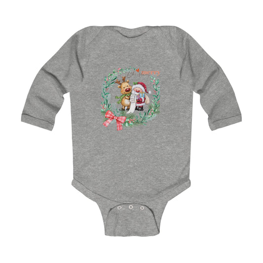 Baby Christmas Bodysuit - 'Merry' Santa & Reindeer Wreath Long Sleeve Infant Onesie