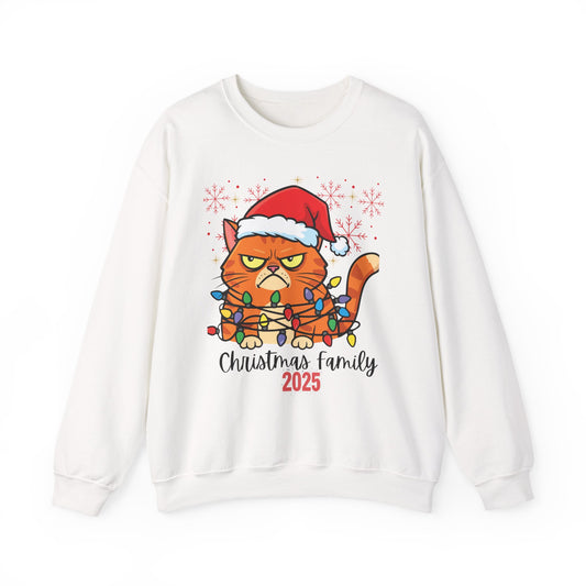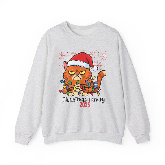 Christmas Cat Crewneck Sweatshirt - "Christmas Family 2025" Cute Grumpy Cat in Santa Hat