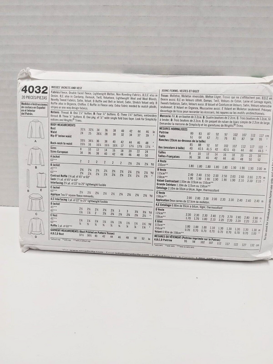 Misses Jackets and Vest Sewing Pattern 16-24 Simplicity 4032