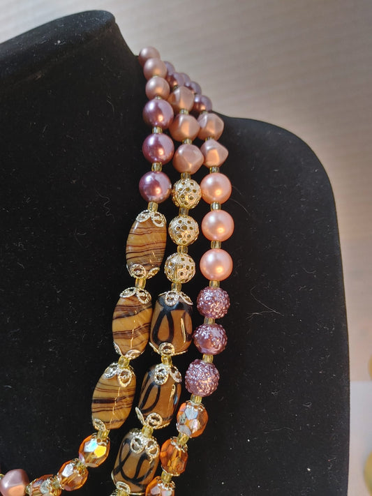 Multi-Strand Art Glass Necklace Fx Pearl Beaded Bib Pink Brown Gold Tone Vintage
