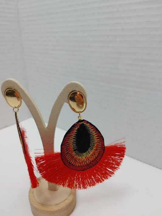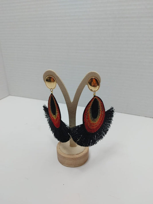 Oval and Fan Shaped Red Black Post Earrings Handmade Bohemian Women Earrings