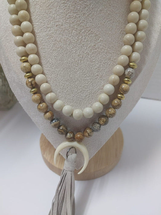 Natural Jasper Gemstone Beads Necklace & Horn Crescent Moon Pendant 36" Bohemian