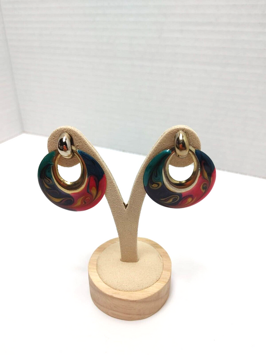 RETRO 1980's Earrings Gold Tone Blue Pink And Green Enamel Dangle Boho Vintage