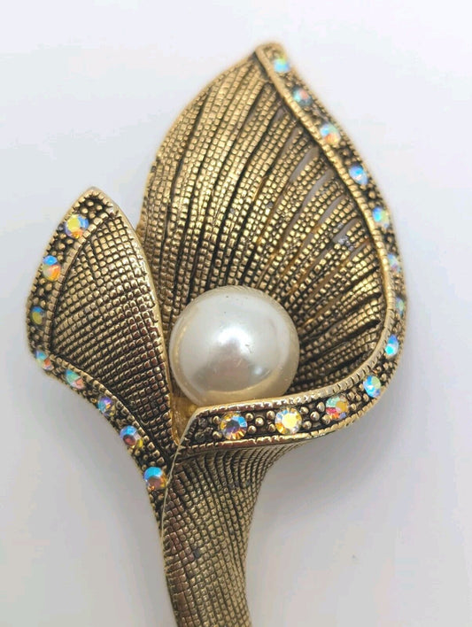 Stunning Faux Pearl AB Rhinestone Gold Tone Calla Lily Brooch Pin Unsigned 1980s