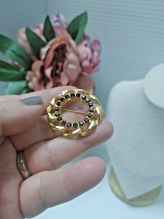 Vintage 1960s Gold Plated Garnet Rhinestone Circle Pin