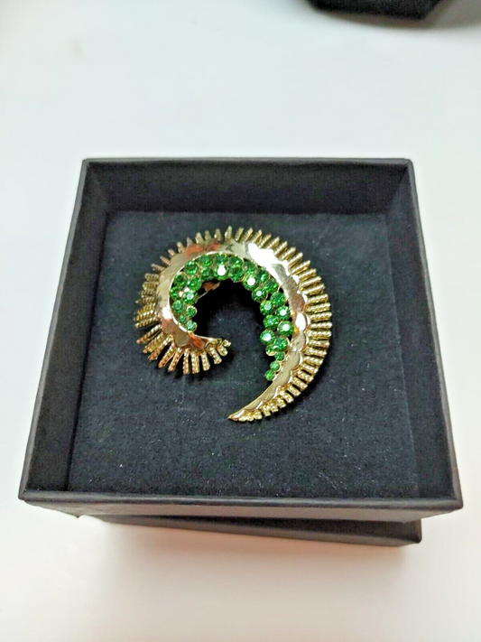 Vintage Brooch Emerald Green Rhinestone Glass Gold Tone Aztec 2"
