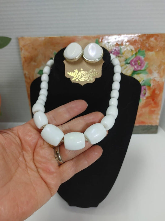 Vintage 50s White Graduated Bead Choker Unique Clasp Necklace Earrings Boho