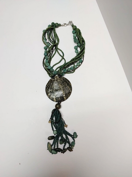 Vintage 70s Large Seashell Pendant Teal Wooden Bead Layered Necklace Green Retro