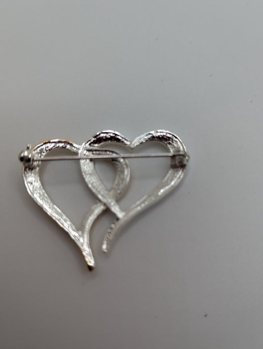 Vintage AB Rhinestones Double Hearts Brooch Pin Goldtone Silvertone