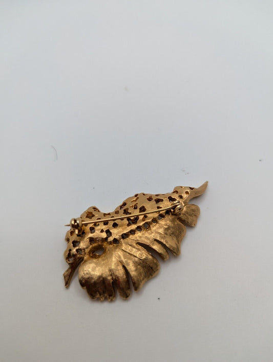 Vintage BSK brooch/earrings set, leaf shape gold tone, Clear Rhinestones