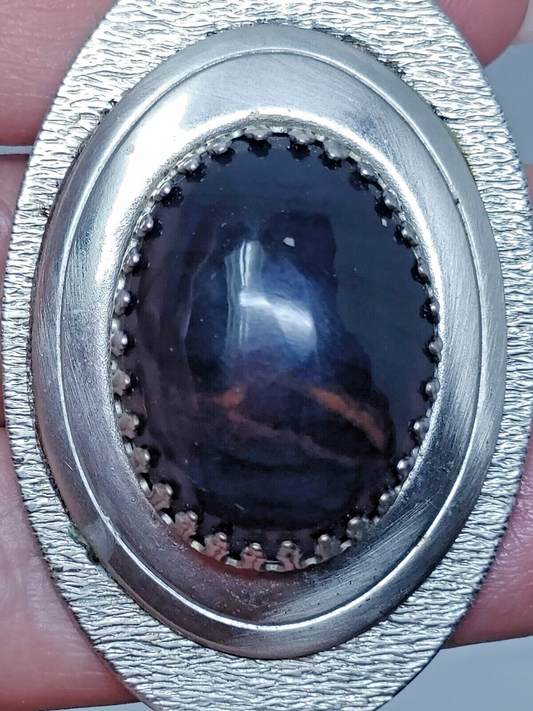 Vintage Large Oval Brooch Pin Pendant Dark Brown Stone Silver Tone