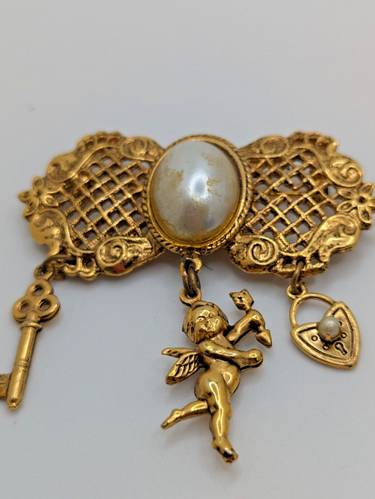 Vintage Goldette Charm Brooch Victorian Revival Dangles Pin Faux Pearl Goldtone