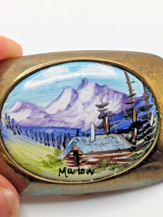Vintage Handpainted Solid Brass Belt Buckle Landscape painting signed Marlow
