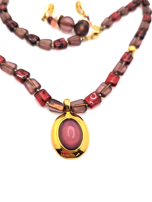 90's Worthington Vtg Necklace Earrige Frosted Cabochon Burgundy Beaded Signed
