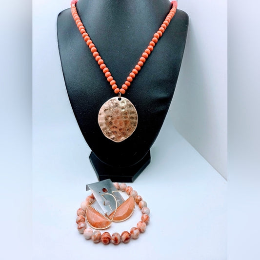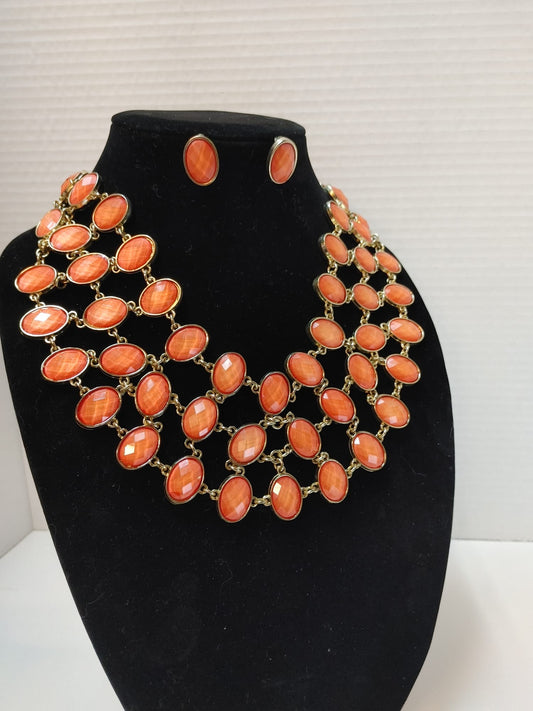 Coral Tone Gold Tone Statement Necklace Stone Earrings Agate Bracelet