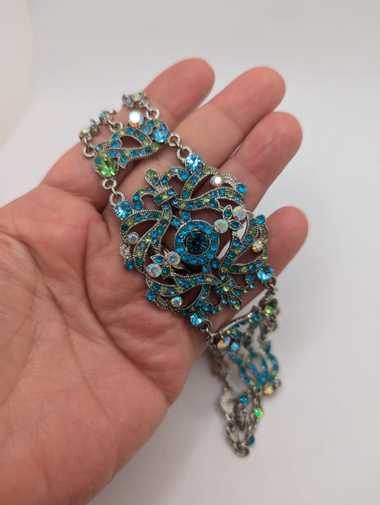 ALDO Chain Statement Necklace Embellished Crystals Chunky Braided Silver Neon