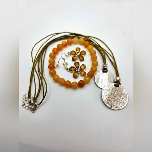 Boho brown and tan SilverTone Necklace Carnelian Bracelet floral Earrings set