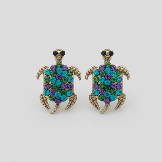 Green and Purple Iridescent Rhinestones Turtle Earrings