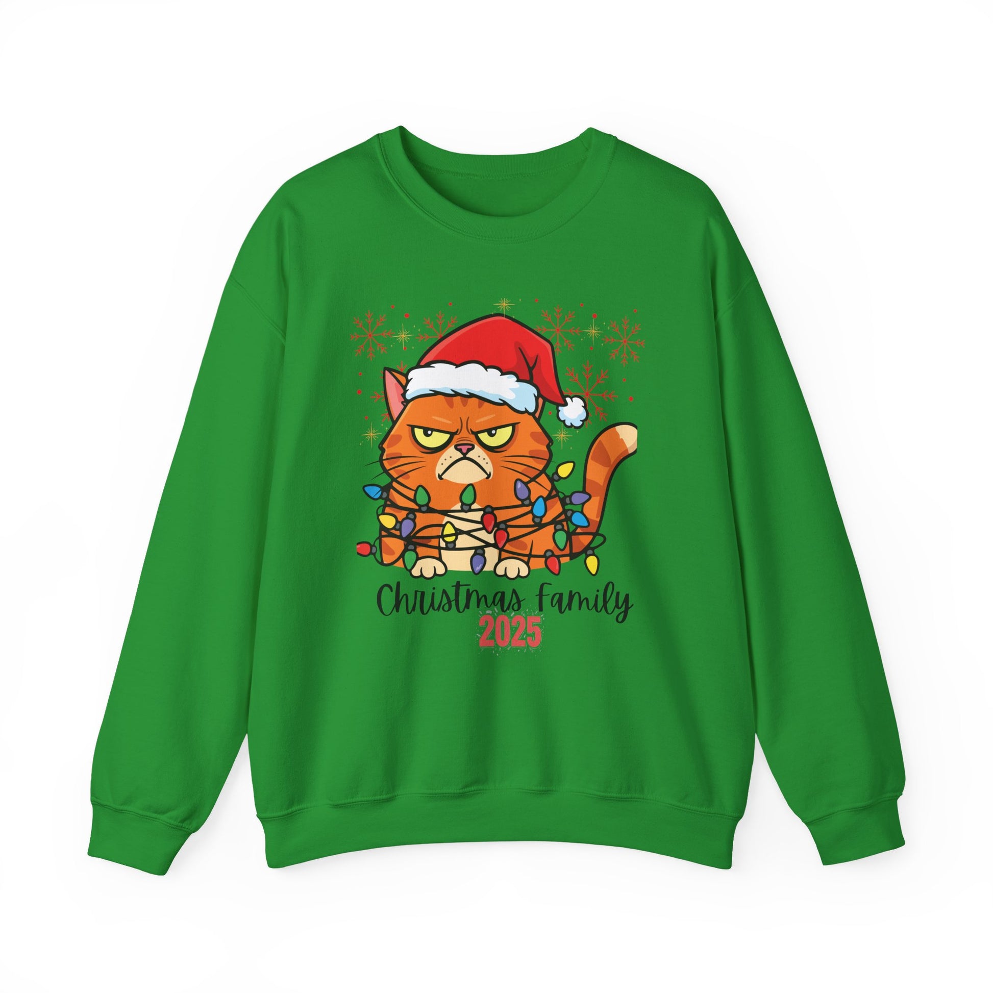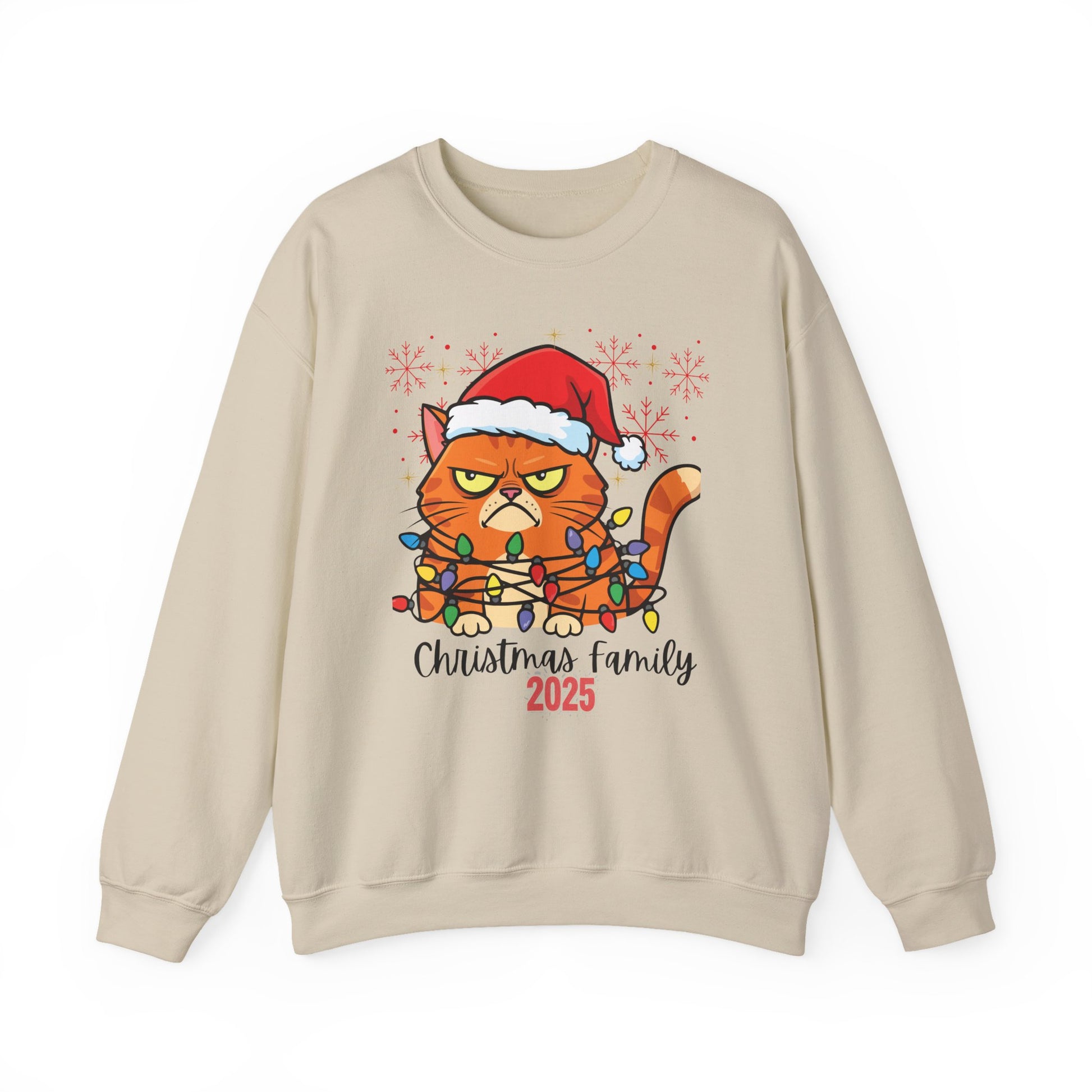 Christmas Cat Crewneck Sweatshirt - "Christmas Family 2025" Cute Grumpy Cat in Santa Hat