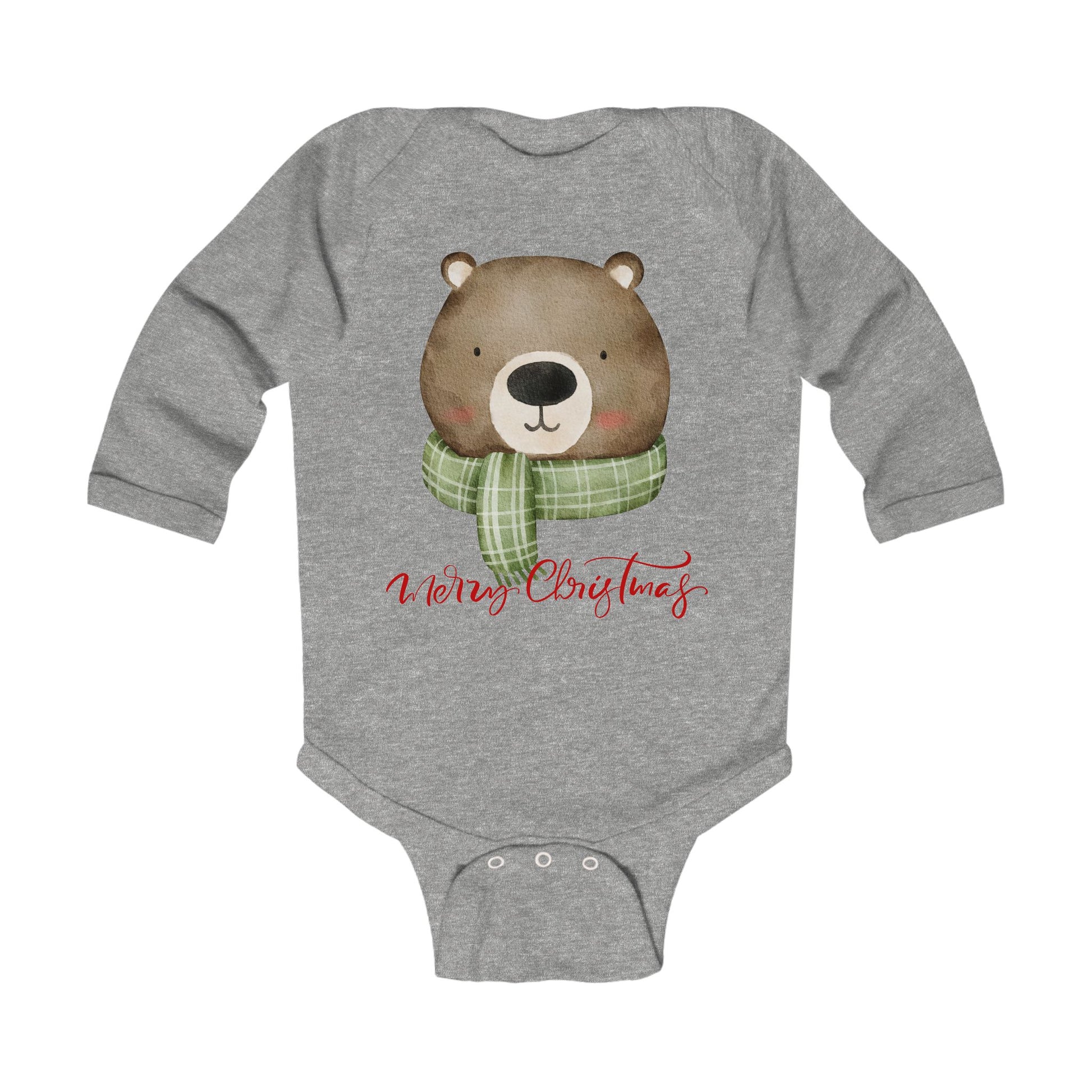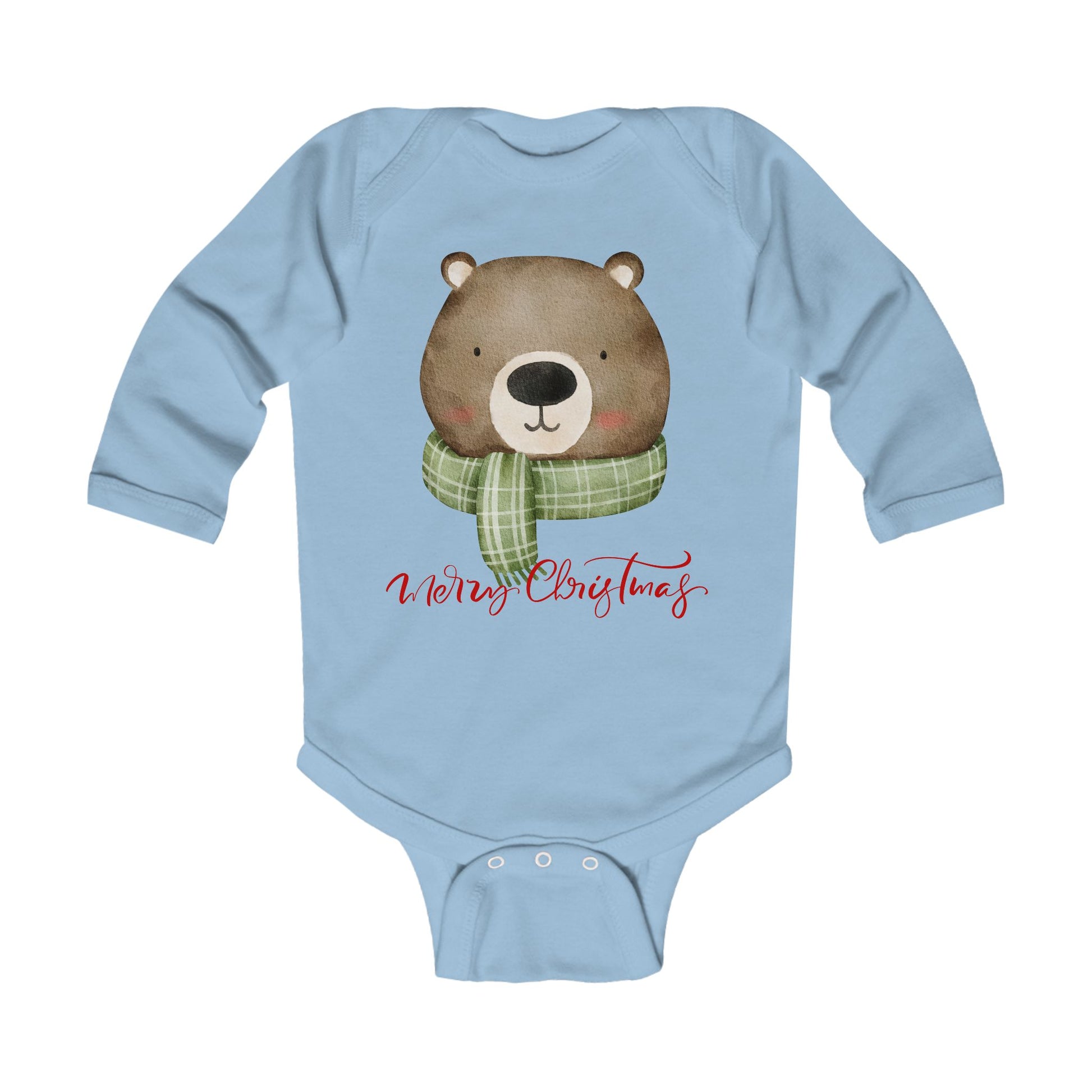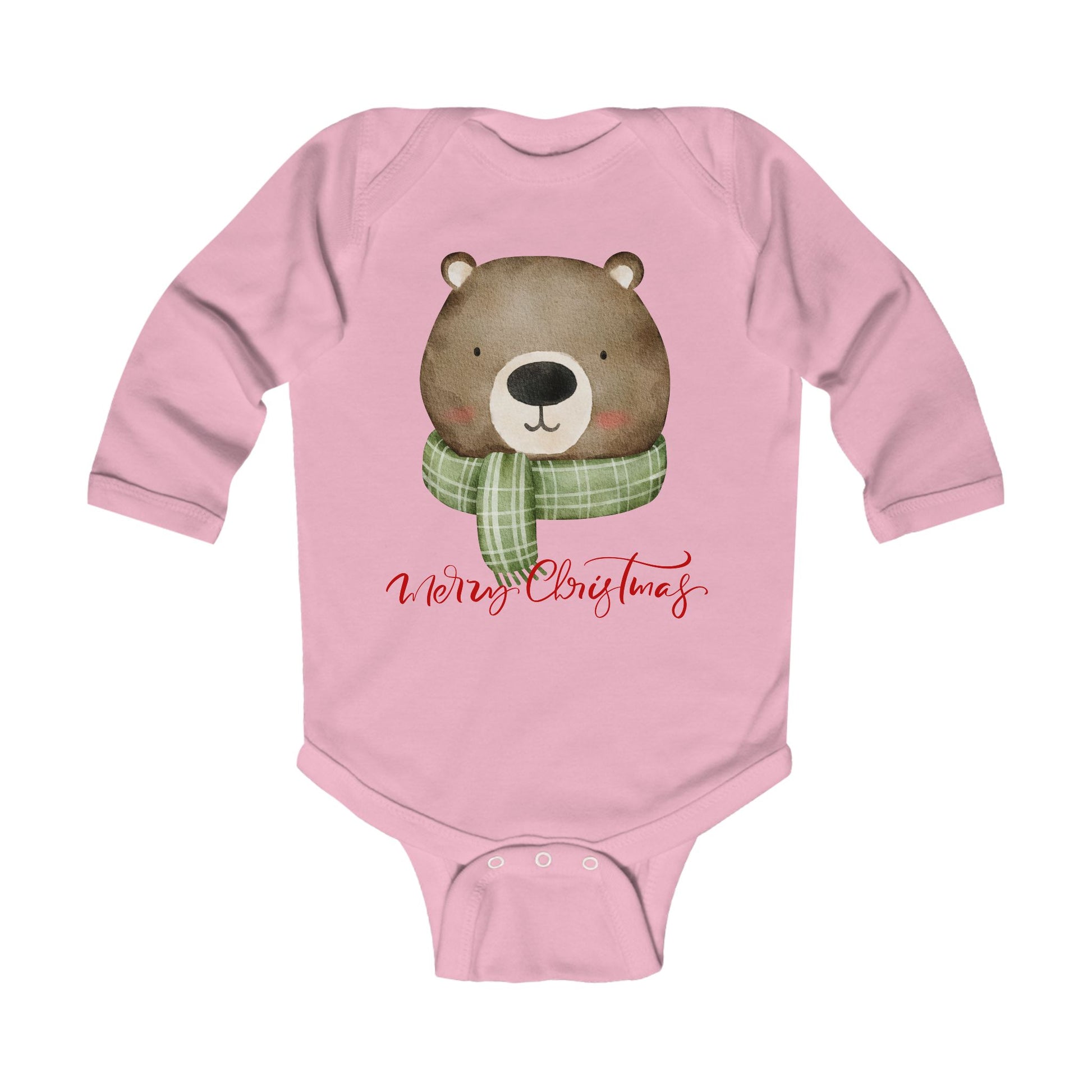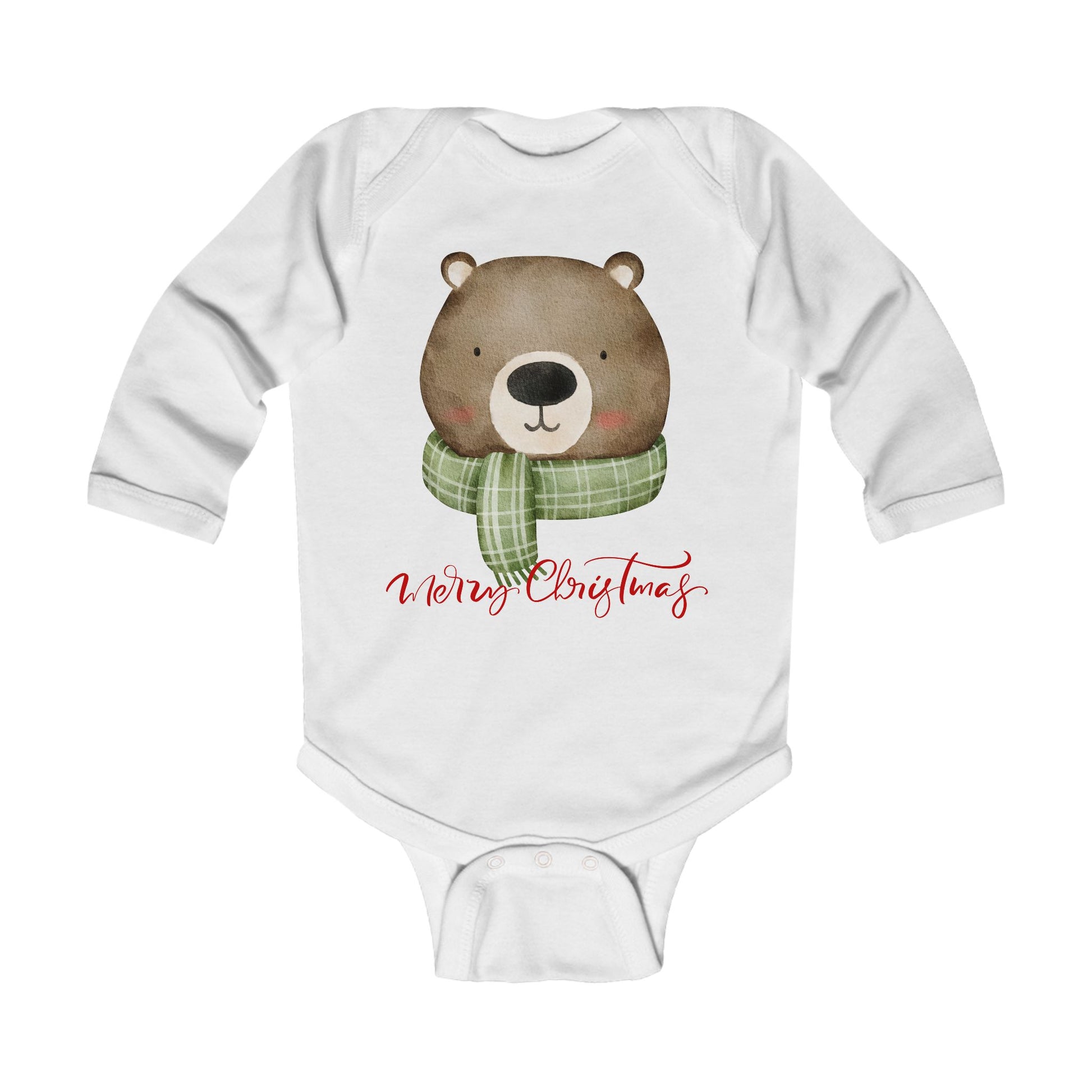 A soft, long-sleeve infant bodysuit featuring a watercolor-style bear wearing a cozy plaid scarf and the hand-lettered phrase “Merry Christmas.” Designed to keep little ones warm and comfortable during holiday moments, it brings a gentle, handmade feel to family photos, tree-trimming afternoons, and quiet evenings by twinkling lights. The light fabric and classic fit allow easy layering under sweaters or over pajamas, while the ribbed neck and three-snap closure make dressing and diaper changes quick and fuss-free. This piece blends seasonal charm with everyday comfort—perfect for cuddles, storytime, and capturing those candid holiday smiles.