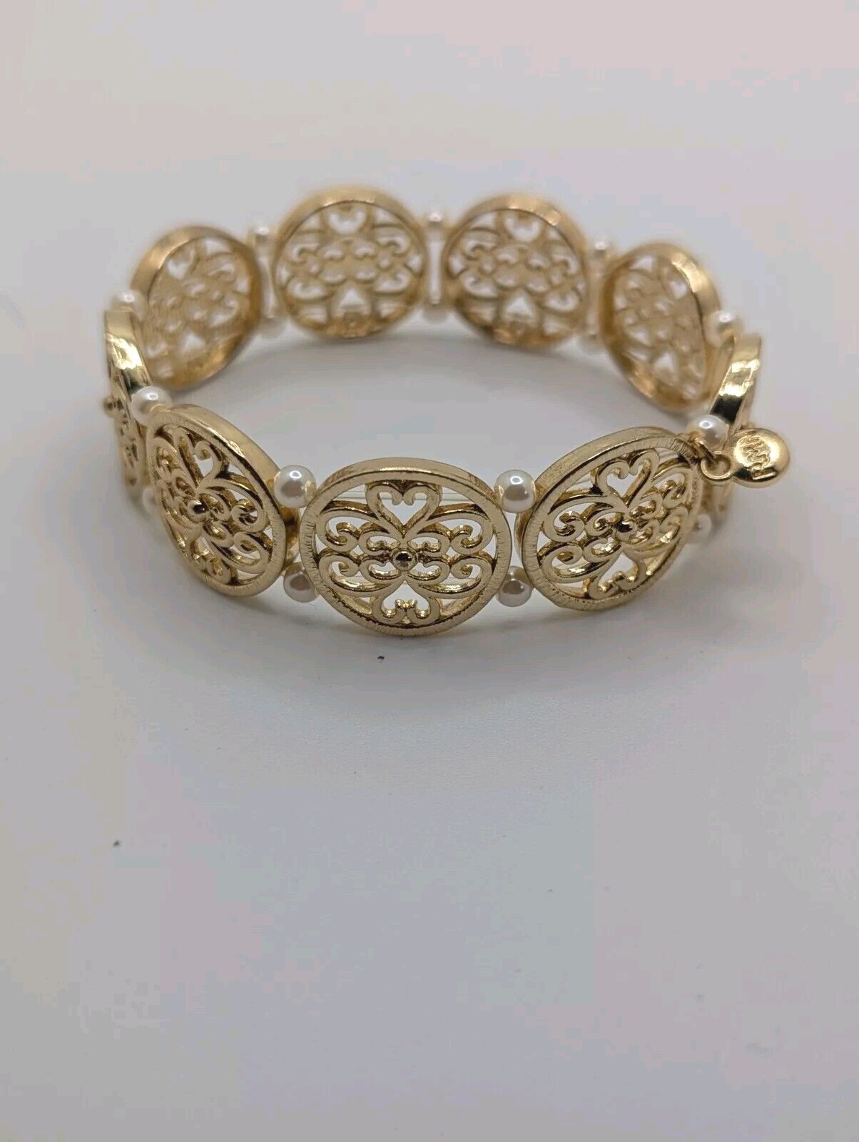 RMN Filigree Gold tone Link Bracelet Stretch Faux Pearls