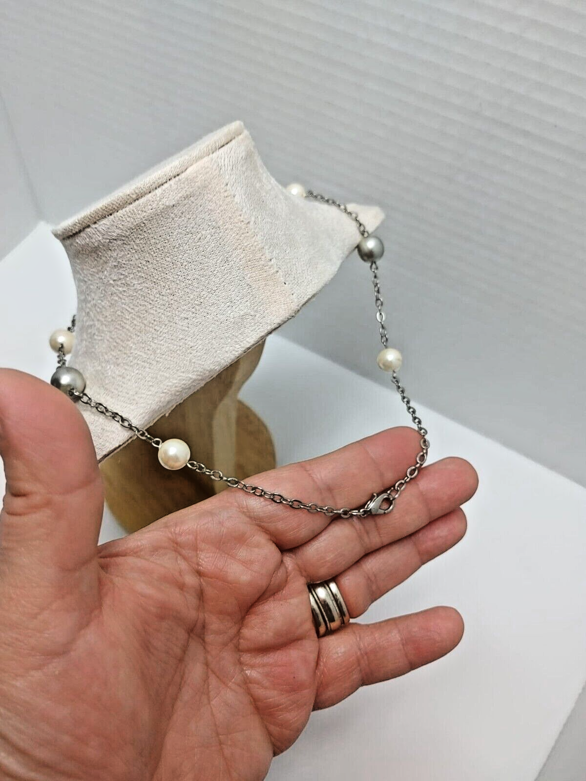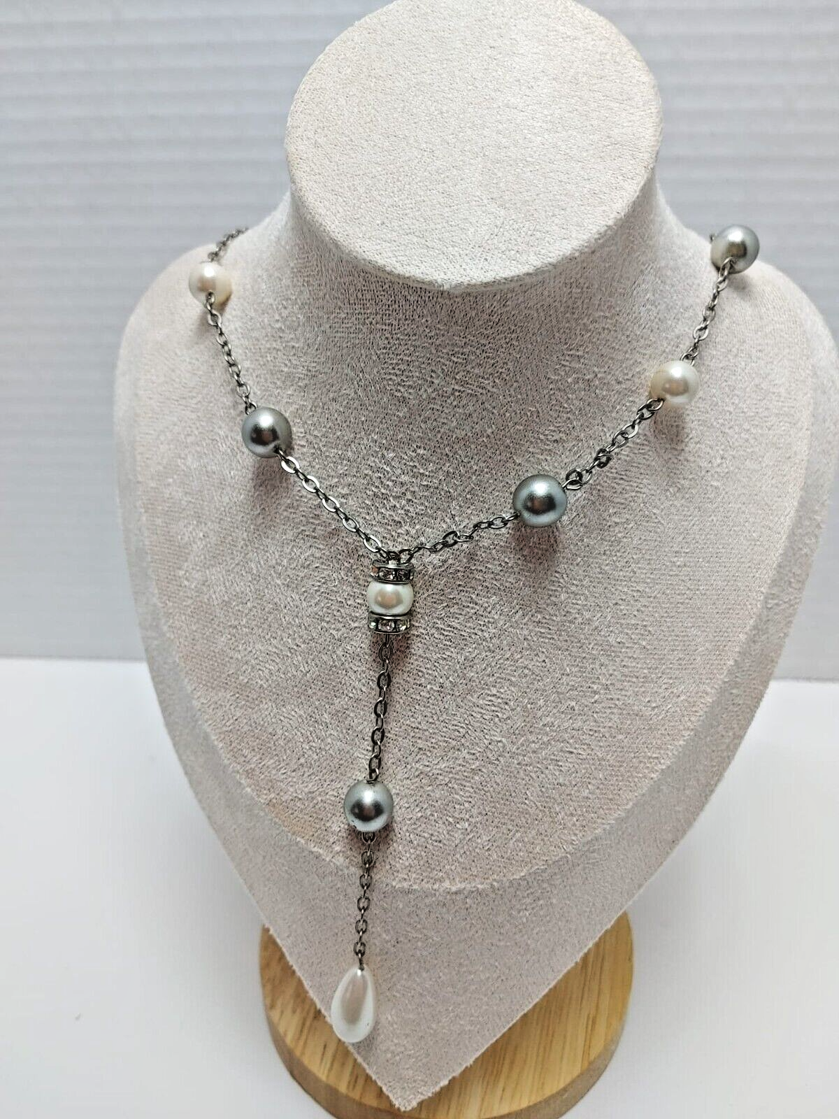 Silver Tone Faux Pearl Rhinestone Chocker Drop Necklace Y Drop Dangle